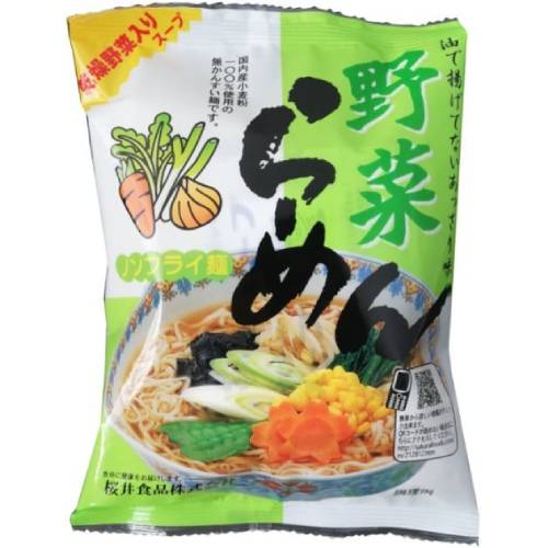 ■商品名:野菜らーめん(ノンフライ)■内容量:90g■原材料:めん[小麦粉(国内製造)、馬鈴薯でん粉、小麦たん白、食塩]、食塩、砂糖、酵母エキス、粉末しょうゆ、香辛料、ポークエキス、乾燥人参、チキンエキス、魚醤パウダーほたてエキス、乾燥小松菜、乾燥玉ねぎ、乾燥ねぎ、乾燥わかめ、するめ粉末、植物油脂、麦芽エキス、(一部に小麦・大豆・豚肉・ごま・いかと含む)■賞味期限:開封前6か月、開封後:できるだけ早くお召し上がり下さい■麺は北海道産契約栽培小麦粉を100%使用、熱風乾燥めんを使用しておりコシのあるあっさり味の野菜ラーメンです